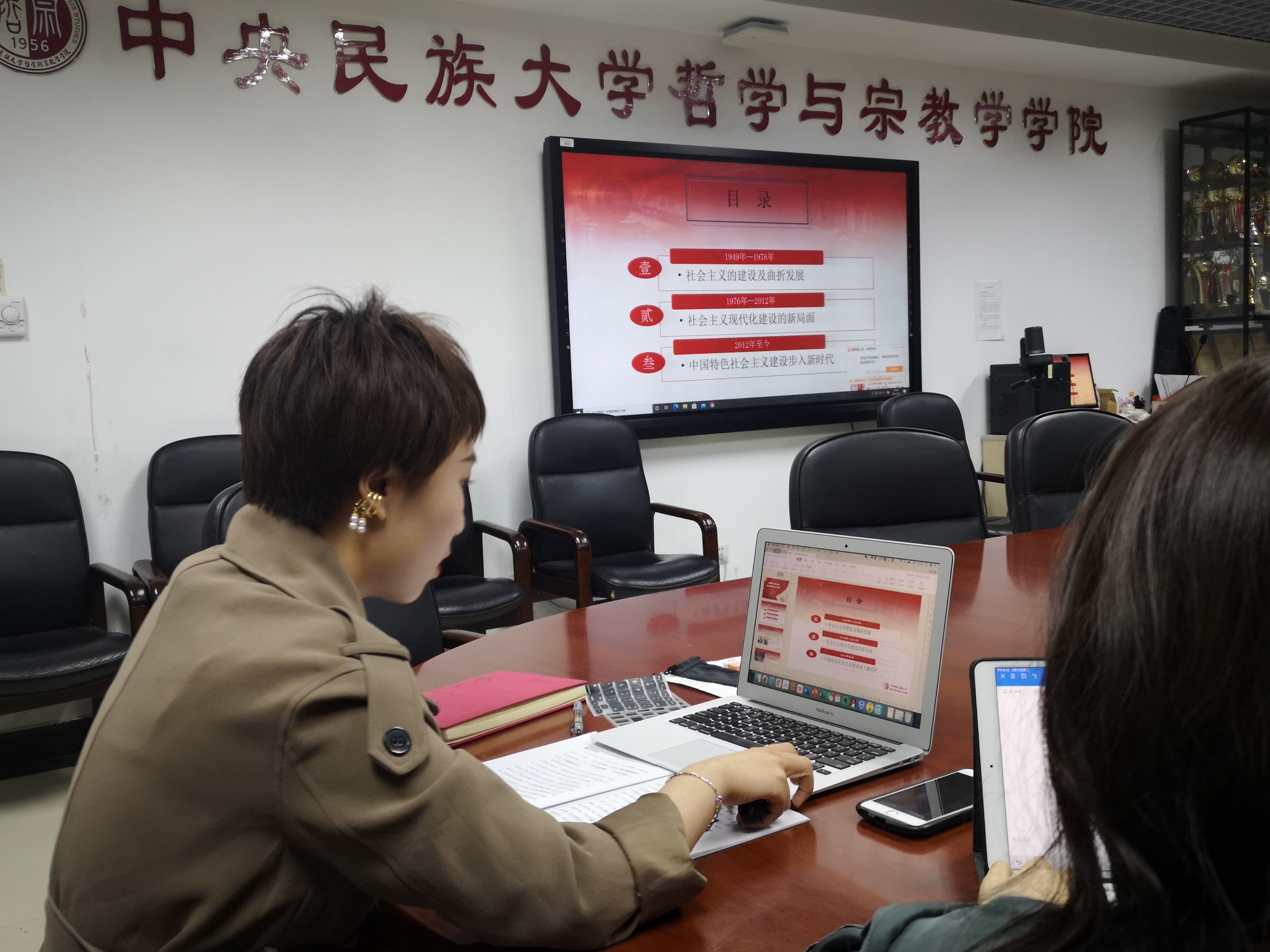 随后,杨扬同志展示了她的宣讲党课《回顾新中国历史践行党的初心使命》。她以时间为线索讲解了新中国社会主义建设和发展的历史,分别是1949年--1976年,社会主义的建设及曲折发展;1976年--2012年,社会主义建设现代化新局面;2012年至今,中国特色社会主义建设进入新时代这三个时间段对中国特色社会主义体系的建设和展望。杨景仪老师表示,杨扬同志的准备工作十分充分,历史事件的梳理和串联方面处理的很完善。同时郑翔予同志提出,讲解党史和新中国史迎合宣讲团主题,其他同志的主题也应紧扣时主旋律。