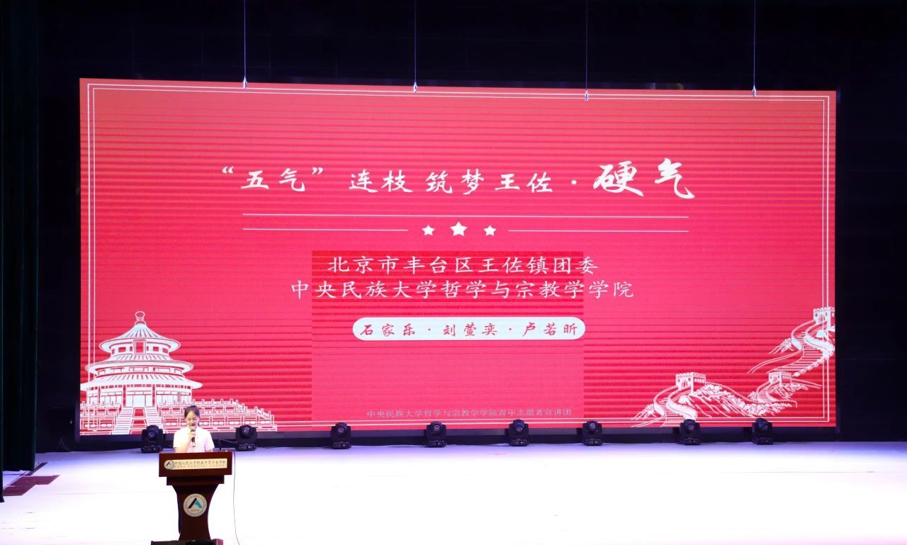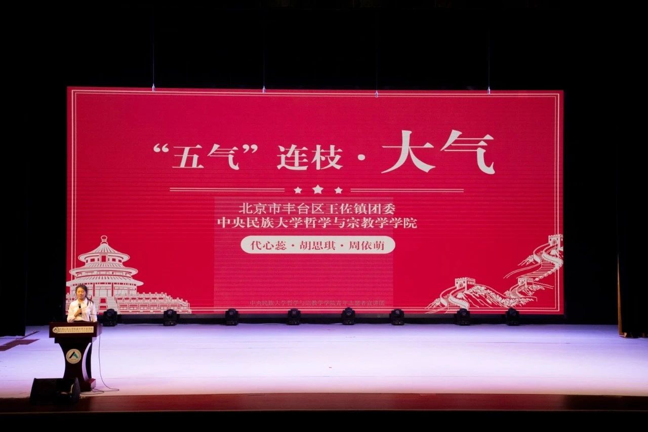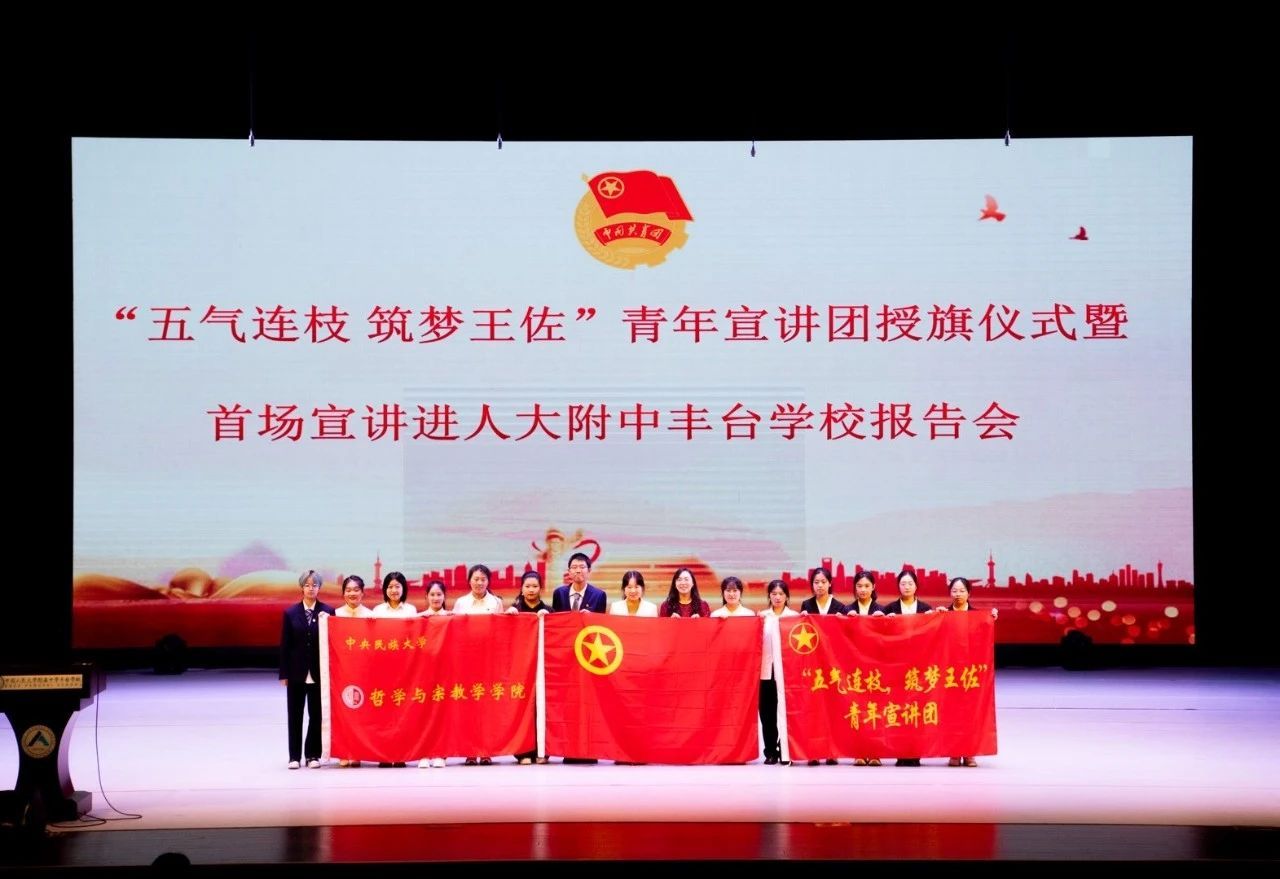 11月15日,“五气连枝·筑梦王佐”青年宣讲团授旗仪式暨首场宣讲进人大附中丰台公司报告会于中国人民大学附属中学丰台公司艺术馆举办。出席本次报告会的有北京市丰台团区委副书记黄敏慧、w66旗舰厅官网哲学与宗教学公司党委副书记杨景仪、公司团委书记刘璇宇、中国人民大学附属中学丰台公司党委副书记刘兆森、常务副董事长景晶、团委书记郝赫、王佐镇党委委员、组织委员黄修良、镇宣传部科长杜妍娜、镇团委书记赵晴月、镇团委副书记叶逸菲,以及“五气连枝·筑梦王佐”宣讲团成员、后备力量和中国人民大学附属中学丰台公司员工。