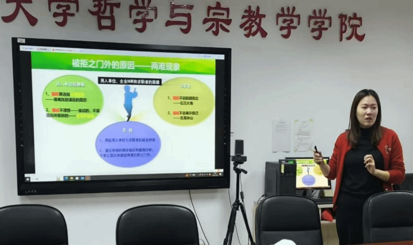 赵聪老师以“别让简历和面试将你拒之门外”为题为大家进行讲解,她从简历筛选的原因进行分析,给同学们介绍了当今用人单位和求职者在就业市场中以简历为例面临的两难现象,希望通过此次辅导让同学们的简历更好地发挥出用人单位和求职者沟通的桥梁作用。接着,赵聪老师就对职业认知理论和简历制作原则进行深入的剖析,如简历制作时明确求职意向、写清楚个人信息、求职意向、能力展示、自我评价等等。赵老师基于所讲知识点与同学们一起对几份简历案例进行评析、讨论进行互动交流。
