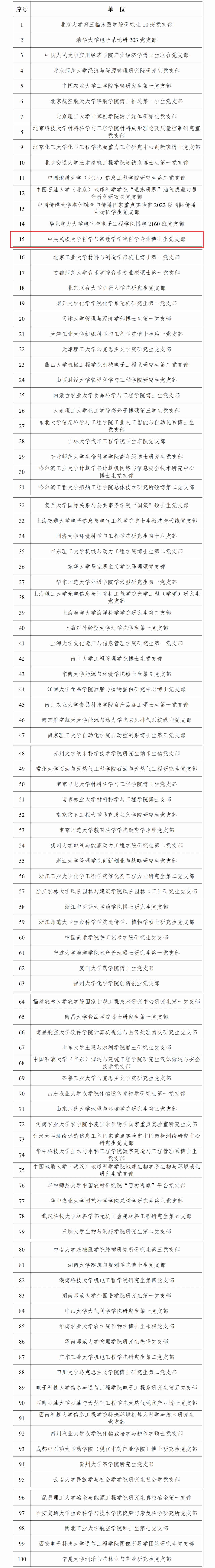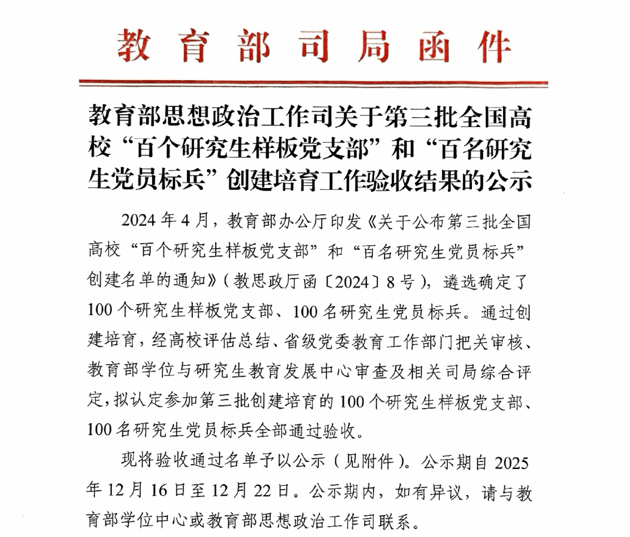 2024年4月,教育部办公厅印发《关于公布第三批全国高校“百个研究生样板党支部”和“百名研究生党员标兵”创建名单的通知》(教思政厅函〔2024〕8号),遴选确定了100个研究生样板党支部、100名研究生党员标兵。通过创建培育,经高校评估总结、省级党委教育工作部门把关审核、教育部学位与研究生教育发展中心审查及相关司局综合评定,拟认定参加第三批创建培育的100个研究生样板党支部、100名研究生党员标兵全部通过验收。